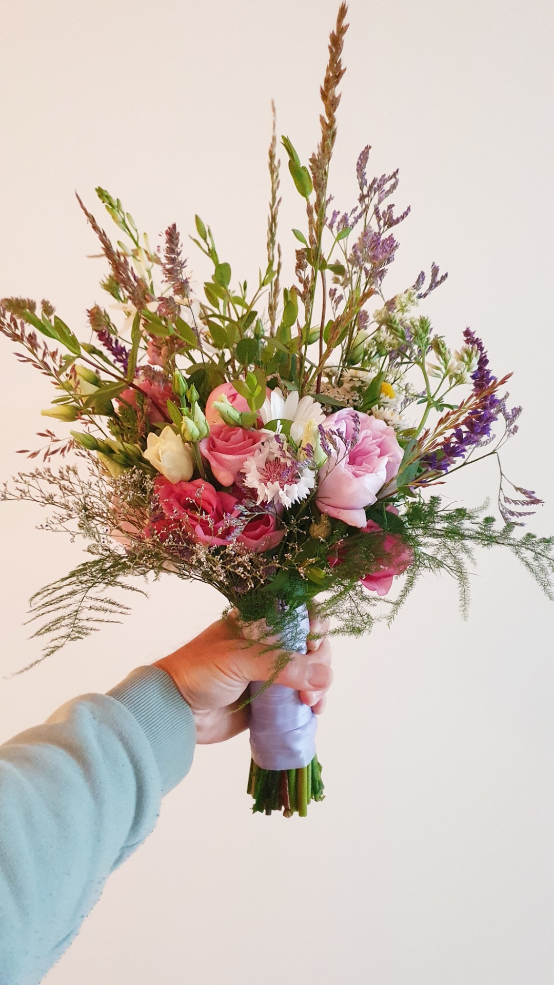 Dit handgebonden boeket is de perfecte mix van romantisch en 'net geplukt'. We combineren zachte rozen en pioenen met de speelse look van een veldboeket, compleet met luchtige grassen, fijne varens en mooie paarse accenten. Super dromerig en heel persoonlijk!