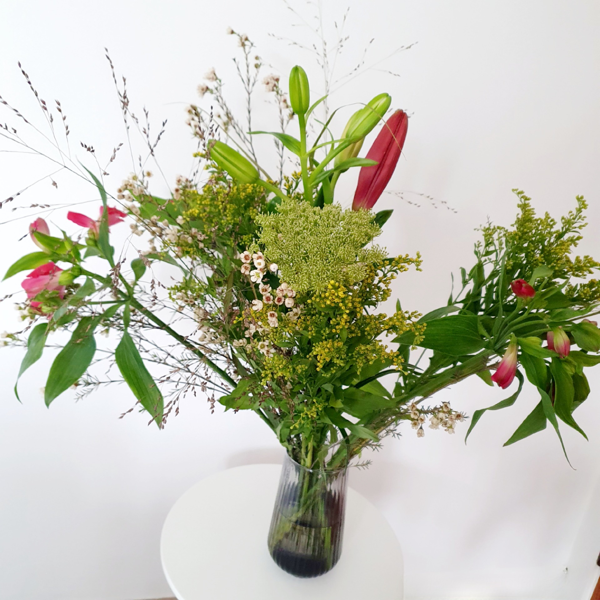 Dit weelderige en wild-groene veldboeket zit vol variatie, met een mix van knallende roze alstroemeria's en statige, gesloten rood-groene lelieknoppen die beloven hun schoonheid nog te onthullen. De basis wordt gevormd door een rijke waaier van diverse groen- en wittinten, waaronder luchtige grasjes en kerstgroen. Dit is een levendig en natuurlijk ensemble dat de charme van een pas geplukte weide vangt en een flinke dosis pure, ongedwongen schoonheid in huis brengt.
