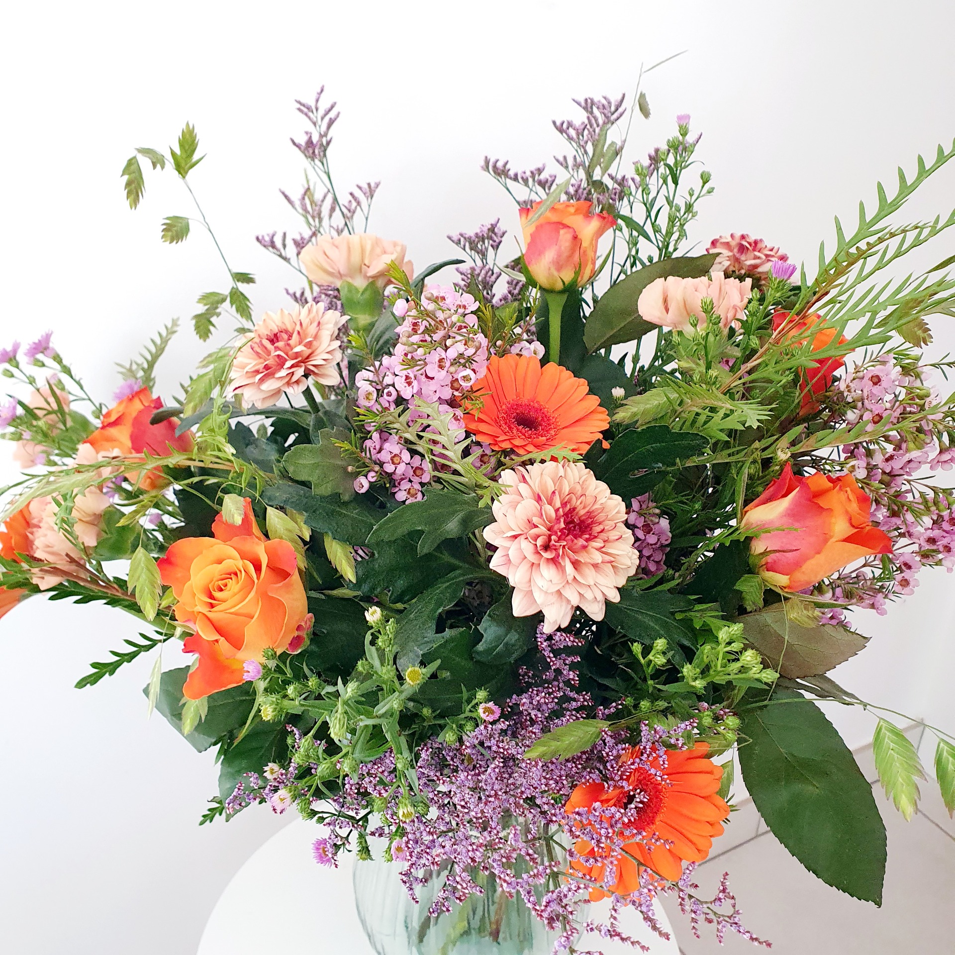 Dit weelderige boeket is een explosie van warmte, gevuld met feloranje gerbera's, prachtige tweekleurige rozen en charmante oudroze bloemen. De fijne paarse waxflowers en wuivende grassen geven het geheel een nonchalante, veldse structuur die perfect in balans is. Met zijn levendige kleuren en rijke vulling is dit boeket een stralend middelpunt dat elke ruimte onmiddellijk opvrolijkt.