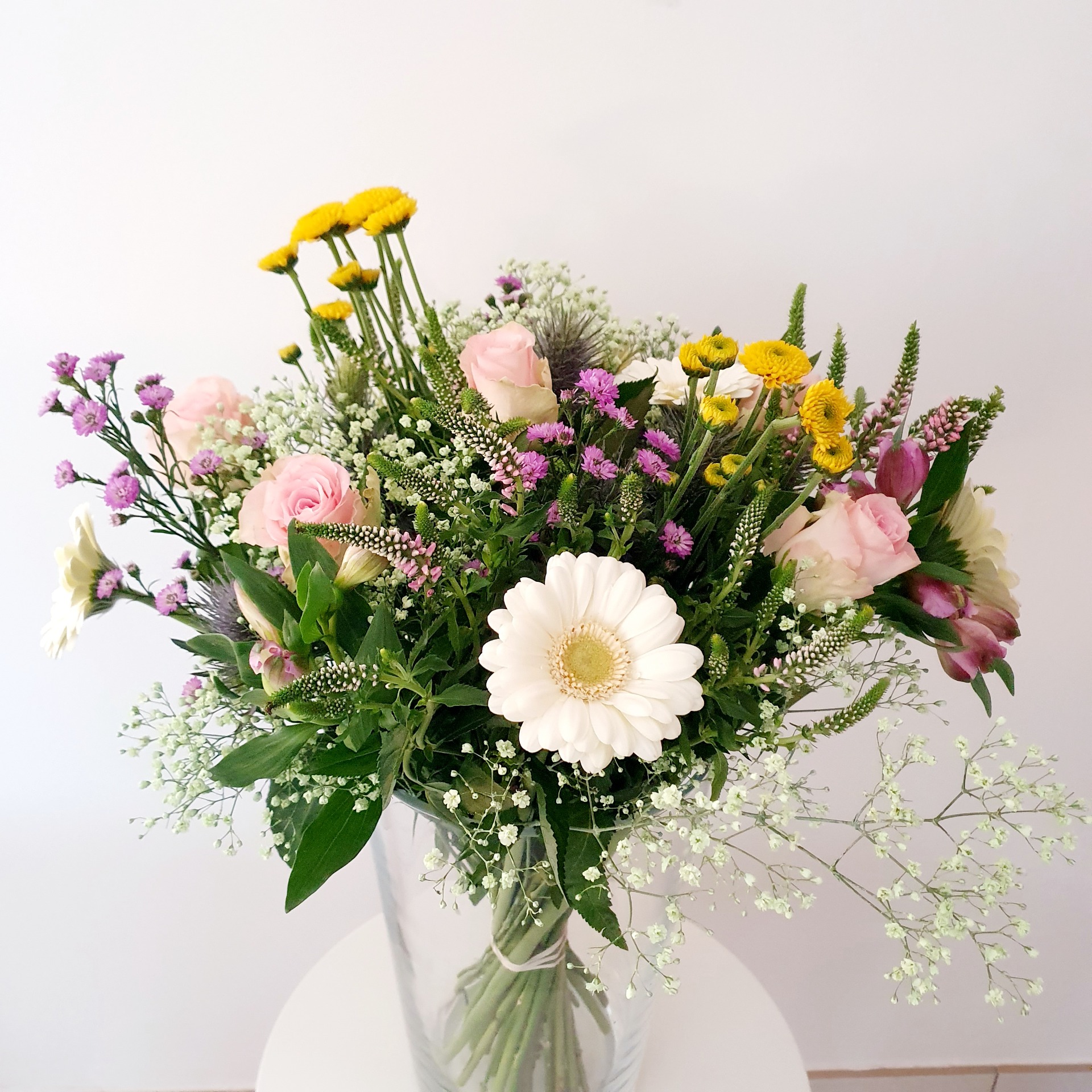 Dit weelderige boeket is een harmonieuze mix van zachte pasteltinten en vrolijke kleuraccenten, met de gerbera en lichtroze rozen als stralend middelpunt. De speelse combinatie van zeeuwse knoopjes, groene anjers en verfijnd astilbe zorgt voor een natuurlijke, veldachtige uitstraling die elk interieur direct opfleurt.