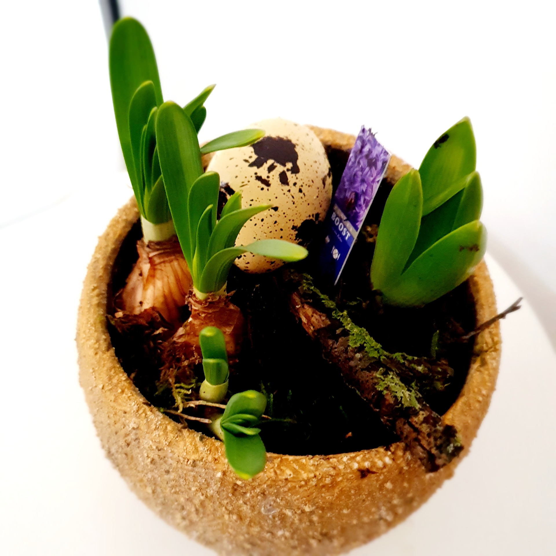 Deze robuuste, stenen schaal is gevuld met ontluikende voorjaarsbollen en fijne groene accenten, subtiel afgewerkt met paaseitjes voor een feestelijke toets. Het is een compact en sfeervol bloemstuk dat perfect past op een vensterbank of als natuurlijke blikvanger op de paastafel. Met dit stuk ben je helemaal klaar voor de lente.