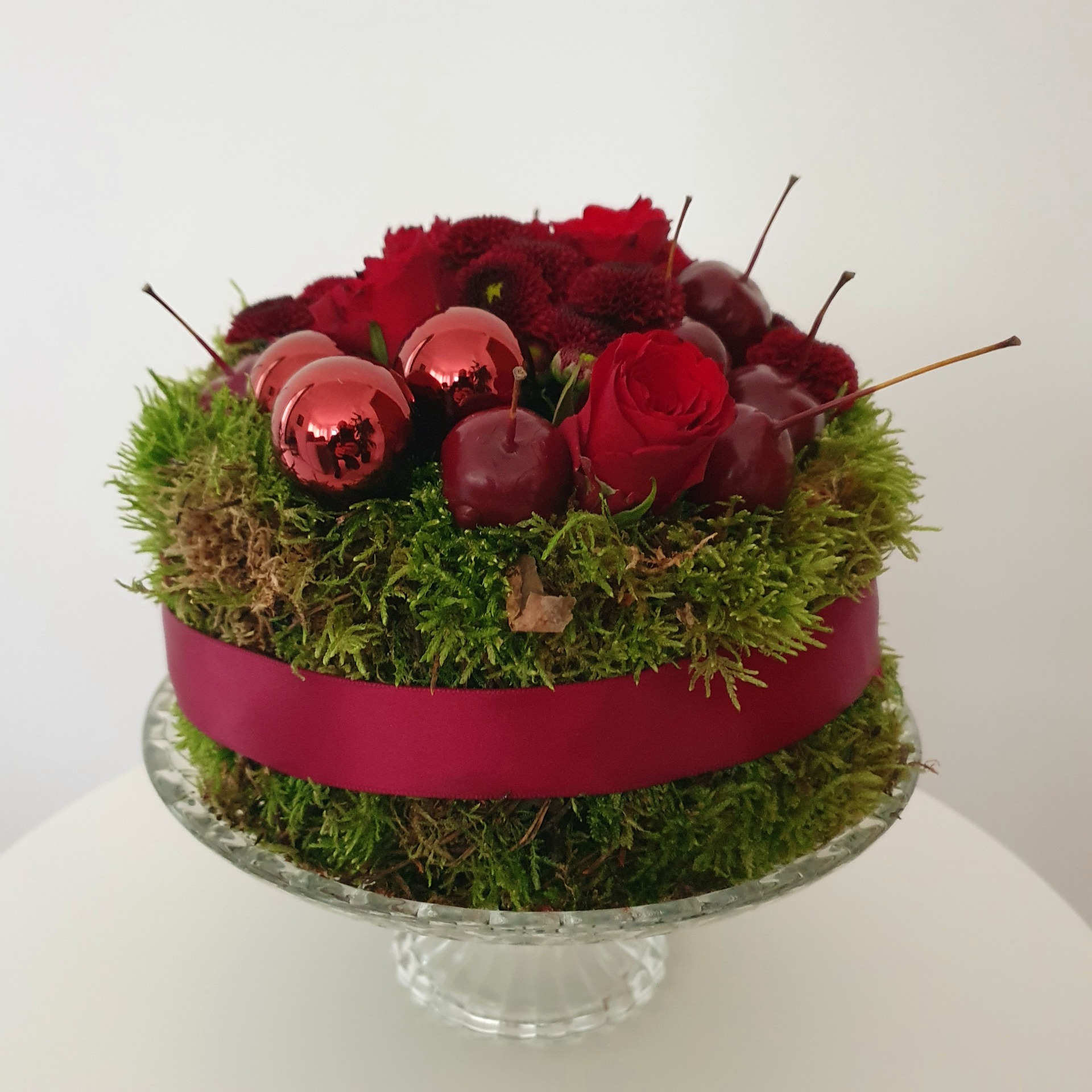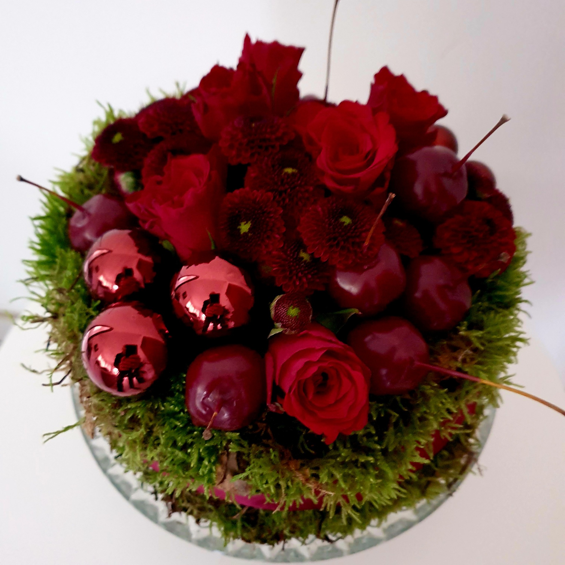 Dit charmante tafelstuk is een gezellig rond arrangement opgemaakt met warmgroen mos en omwikkeld met een glanzend lint, ideaal als tafeldecoratie. De top is rijk gevuld met Santini chrysanten en rozen, aangevuld met glinsterende, berijpte appeltjes en decoratieve bessen. Dit compacte stuk straalt sfeer, warmte en feestelijkheid uit en is het perfecte geschenk om de donkere dagen op te fleuren.