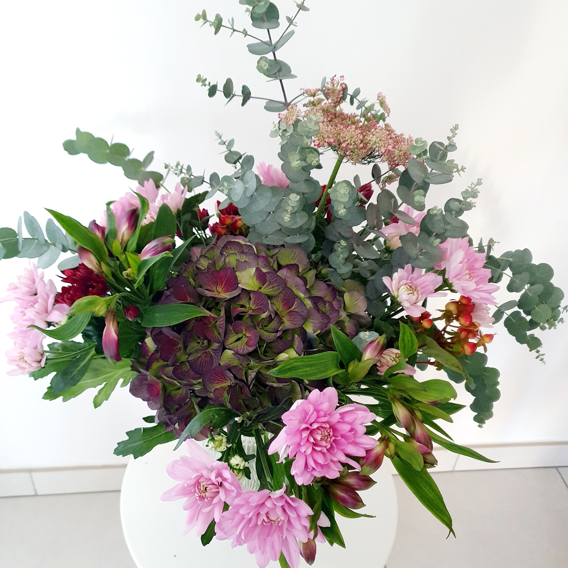 Dit elegante boeket brengt een zachte winterse sfeer in huis met een prachtige mix van frisse roze chrysanten en een dieppaarse hortensia als sfeervol middelpunt. De grijsgroene eucalyptusbladeren reiken speels omhoog en verspreiden een subtiele, natuurlijke geur door de kamer. Samen met de fijne details van de Alstroemeria en herfstachtige besjes vormt het een stijlvol en harmonieus geheel voor de feestdagen. Een topper op de feesttafel.