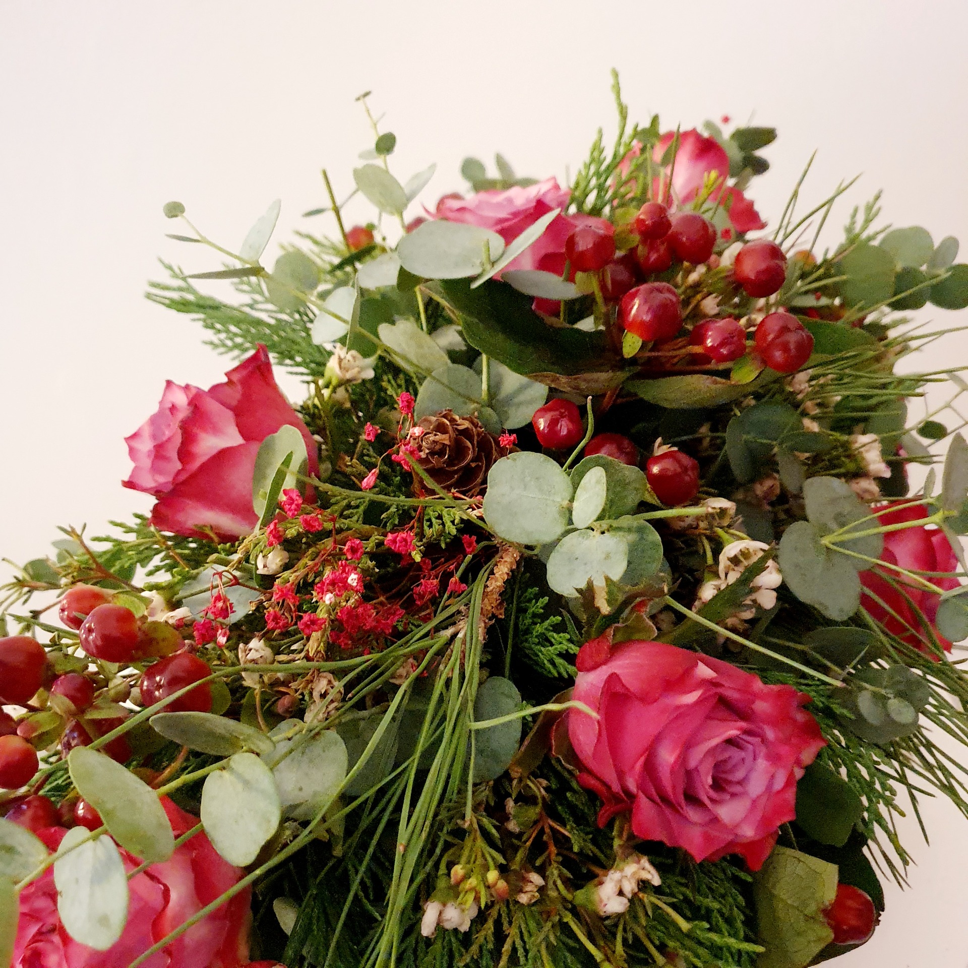 Deze Kerstbuche is een rijkgevuld kerstarrangement dat garant staat voor een warme en luxe uitstraling op uw kersttafel. Dit lage, volle stuk combineert fluweelzachte, dieprode rozen met weelderig kerstgroen zoals Cederloof en pijnboom naalden, aangevuld met zilvergroene Eucalyptus en feestelijke bessen. Het is de perfecte, natuurlijke blikvanger om het hart van uw kerstdiner te versieren, die de gezelligheid en de geur van de feestdagen in huis brengt.