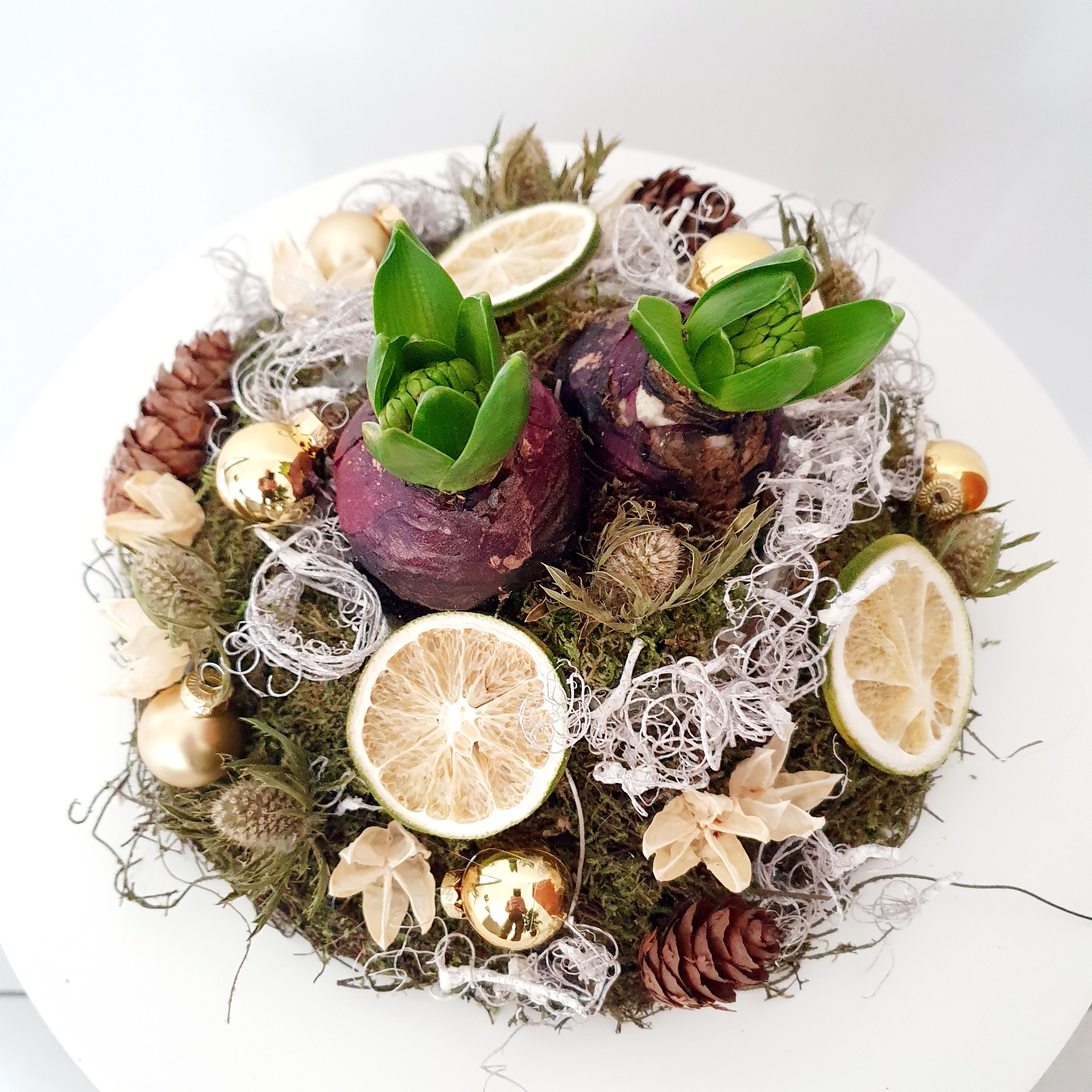 Dit charmante kerststukje combineert het frisse groen van ontluikende hyacinten met de aarde tinten van een natuurlijk mosbed. Gedroogde citrusschijfjes, sierlijke dennenappels en zilveren krullen geven het geheel een subtiele, feestelijke glans. Met een diameter van 25 cm is dit een perfect, sfeervol accent voor op de salontafel of vensterbank.