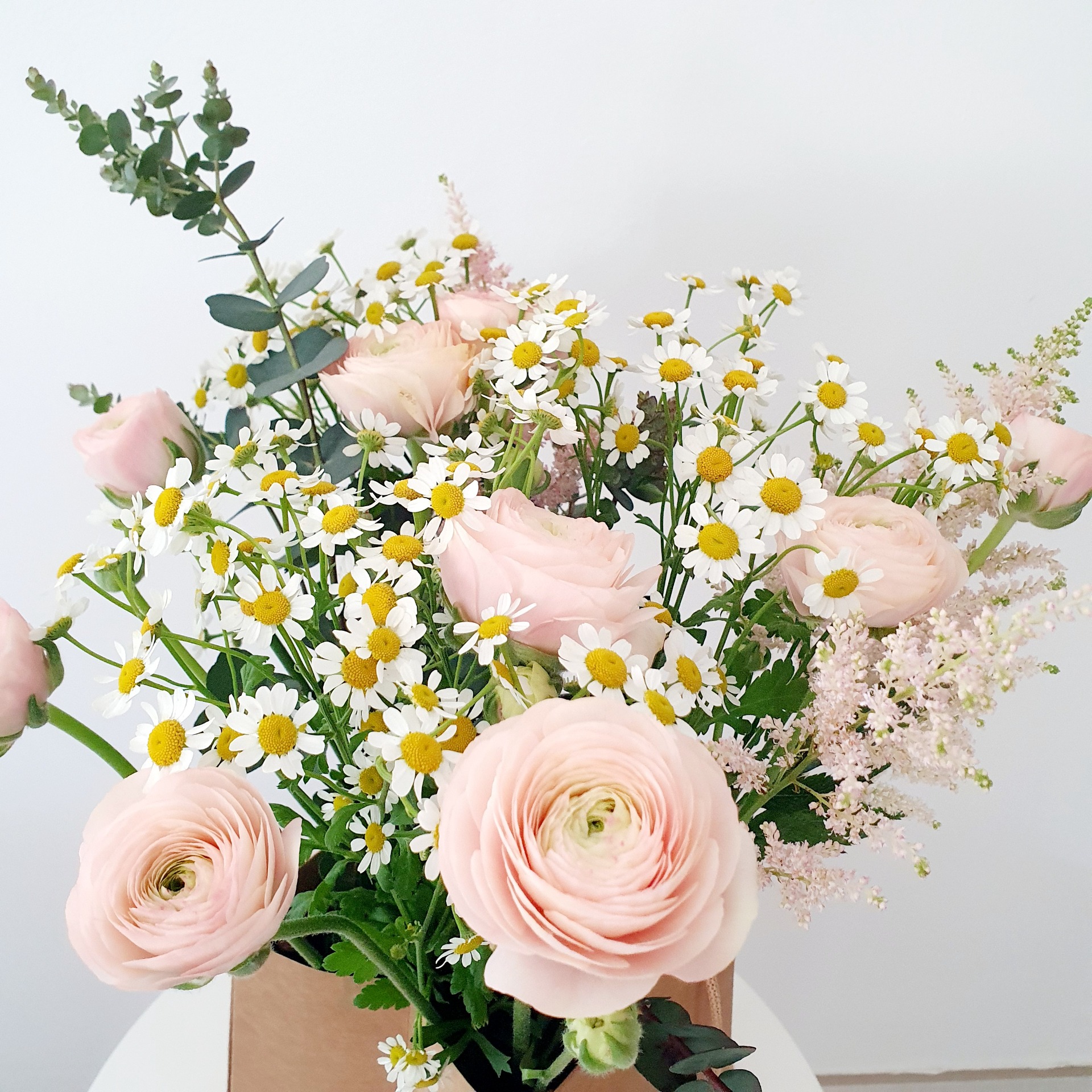 Dit charmante boeket straalt pure zachtheid uit dankzij de romantische mix van pastelroze ranonkels en luchtige pluimen van astilbe. De toevoeging van vrolijke kamillebloemetjes en frisgroene eucalyptus zorgt voor een natuurlijke, veldse twist die elk interieur direct opfleurt. Gepresenteerd in een stijlvolle, kraftpapieren draagtas is dit het ideale, kant-en-klare geschenk om iemand op een unieke manier te verrassen.