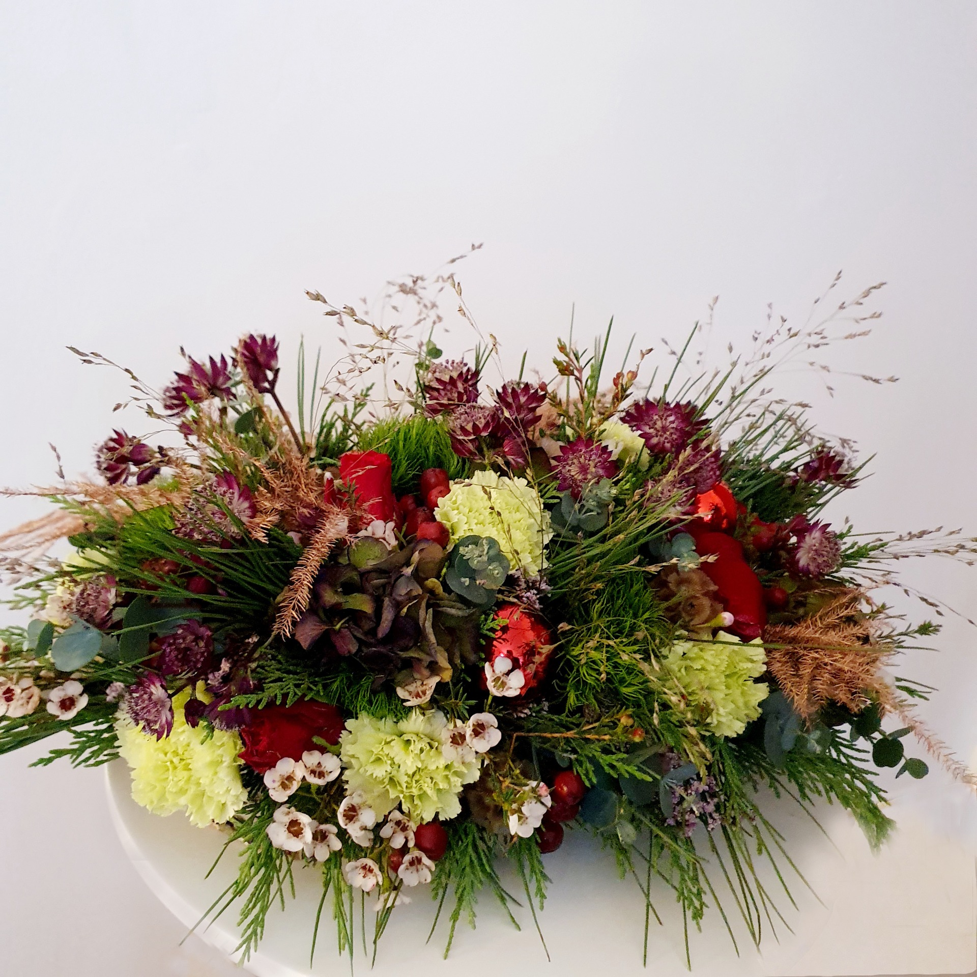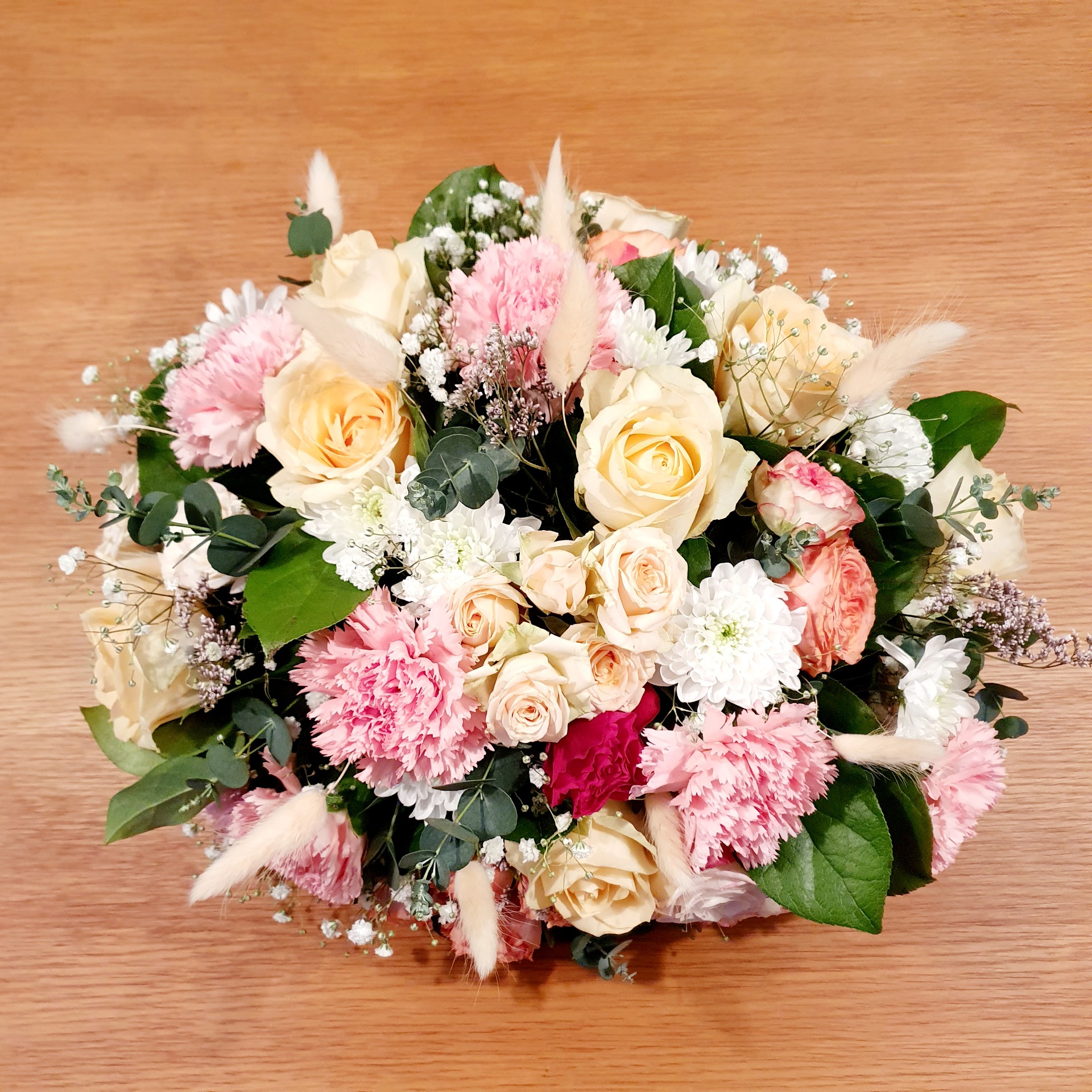 Bij Flora & Kamiel creëren we met liefde een uniek bloemstuk dat volledig is afgestemd op jouw persoonlijke wensen en interieur. Om een resultaat te garanderen dat perfect bij je past, bespreken we de gewenste kleur en stijl altijd telefonisch. Tijdens dit korte overleg kijken we samen naar de mooiste seizoensbloemen en stemmen we het bloemwerk af op jouw gekozen budget. Neem contact met ons op via 0477 50 98 37 en laat ons een bijzonder stuk natuur voor je samenstellen. Voorbeeld op de foto is een tafelstuk van 48 €.