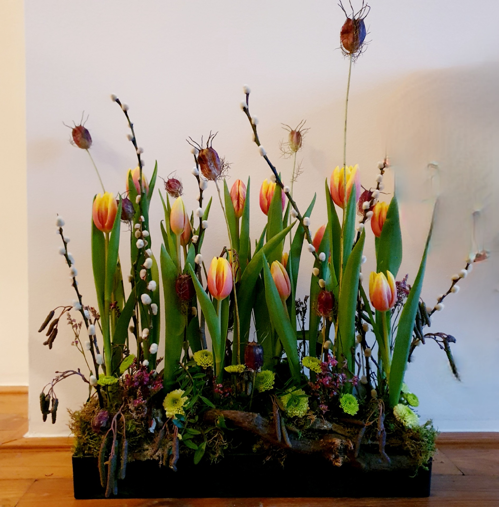 Bij Flora & Kamiel creëren we met liefde een uniek bloemstuk dat volledig is afgestemd op jouw persoonlijke wensen en interieur. Om een resultaat te garanderen dat perfect bij je past, bespreken we de gewenste kleur en stijl altijd telefonisch. Tijdens dit korte overleg kijken we samen naar de mooiste seizoensbloemen en stemmen we het bloemwerk af op jouw gekozen budget. Neem contact met ons op via 0477 50 98 37 en laat ons een bijzonder stuk natuur voor je samenstellen. Voorbeeld op de foto is een tafelstuk met tulpen van 42x10cm en +/- 50cm hoog, ter waarde van 48 €.