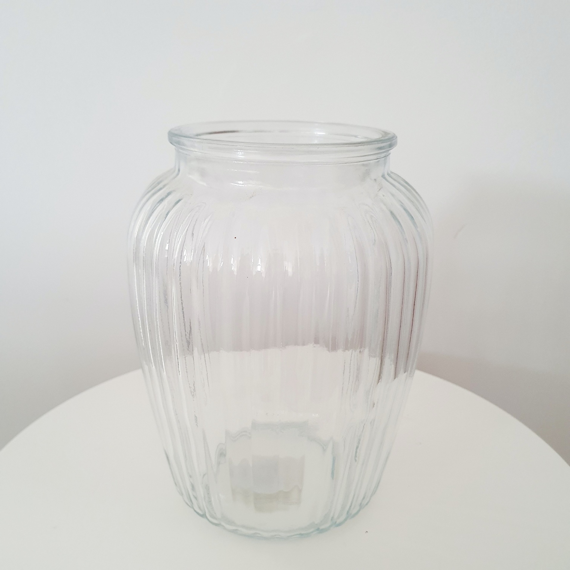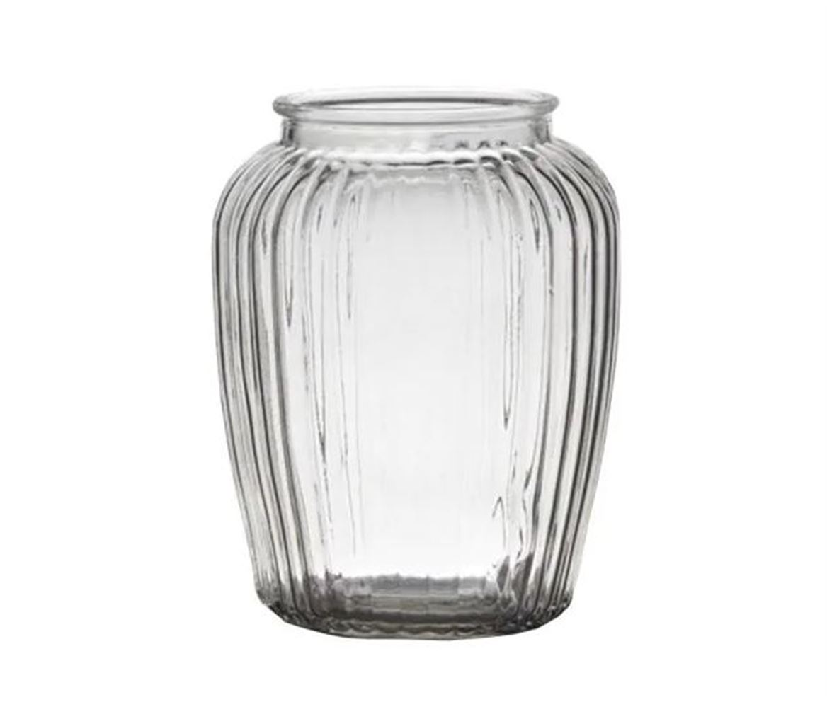 Deze elegante, heldere glazen vaas valt op door zijn verfijnde verticale ribbeltextuur en een klassiek ronde vorm. Dankzij de subtiel ingesnoerde hals is hij ideaal voor een compact boeket of een selectie stijlvolle droogbloemen. Vaas is 19,5 cm hoog.